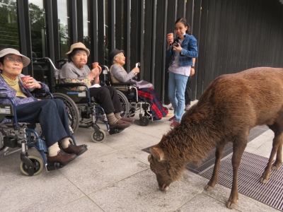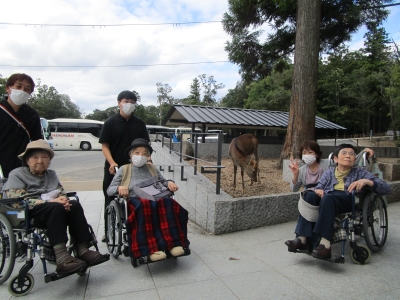 秋の外出イベントとして、奈良公園で鹿と戯れる様子や、ソフトクリームを食べたりしながら、